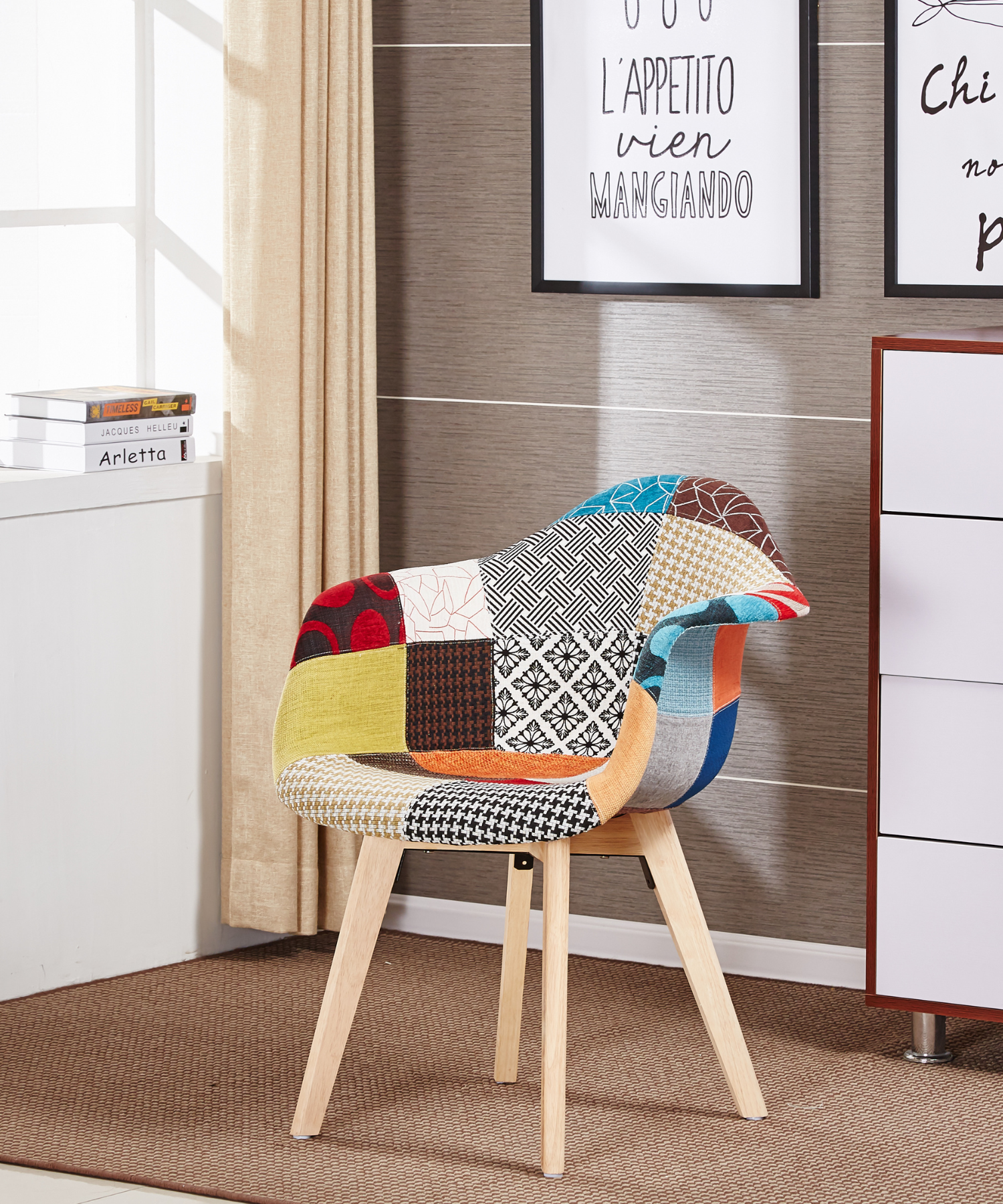 Patchwork Eiffel Tub Chair Fabric Upholstery - Wooden Legs with Metal Frame