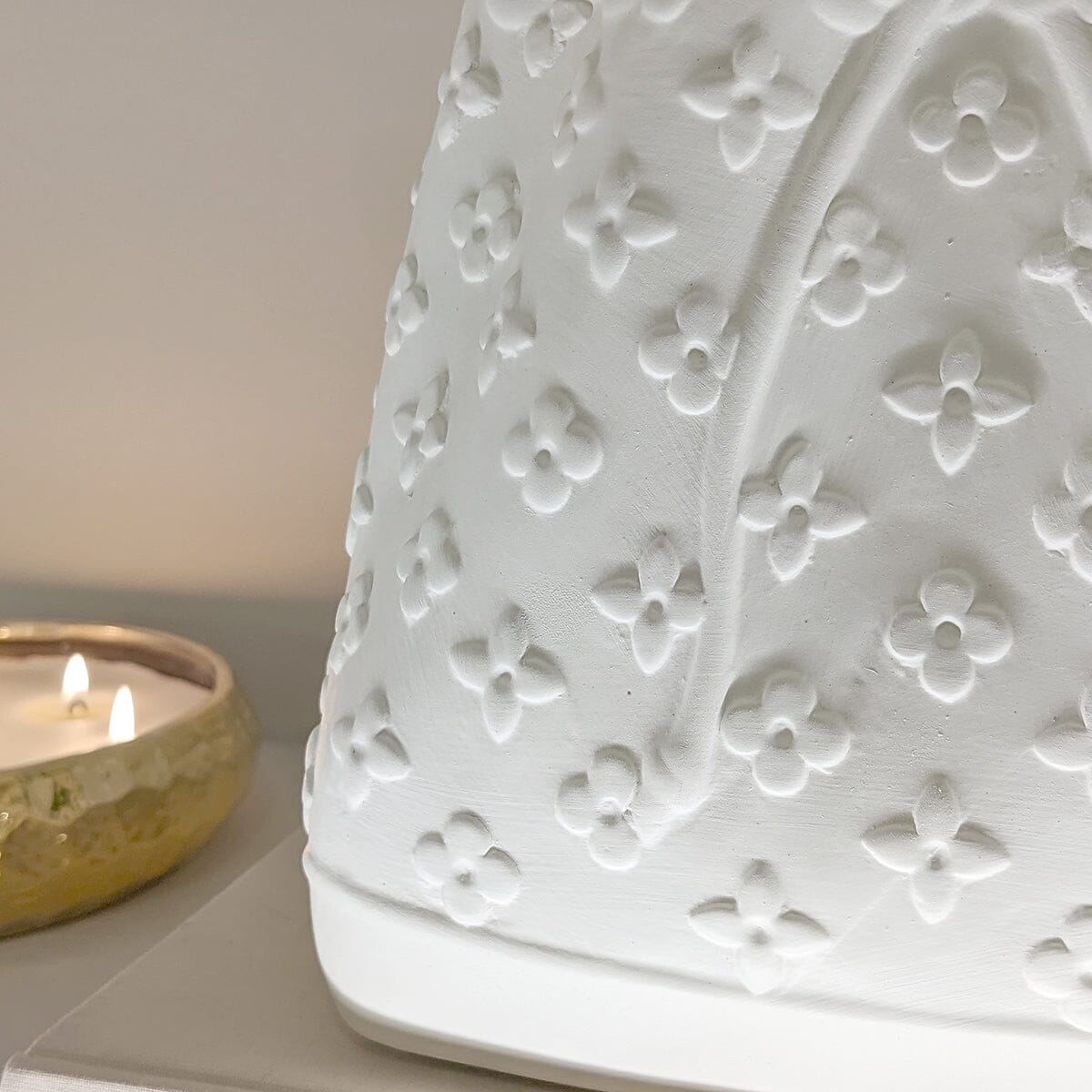 Designed to mimic a classic handbag, this ceramic ornament features an elegant embossed floral pattern and a smooth white finish.