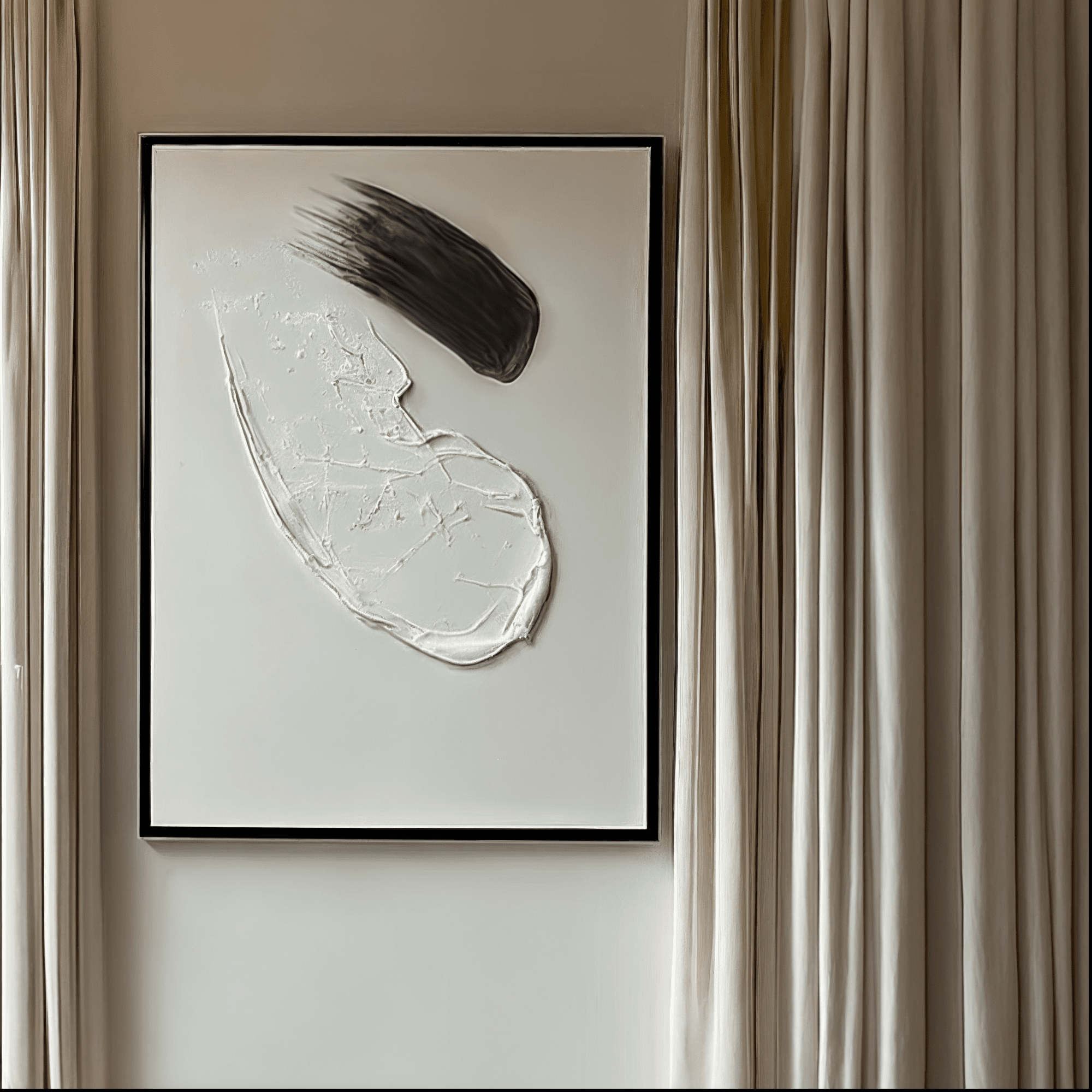 Featuring bold black strokes and raised white textures, this piece creates a modern, minimalist statement.