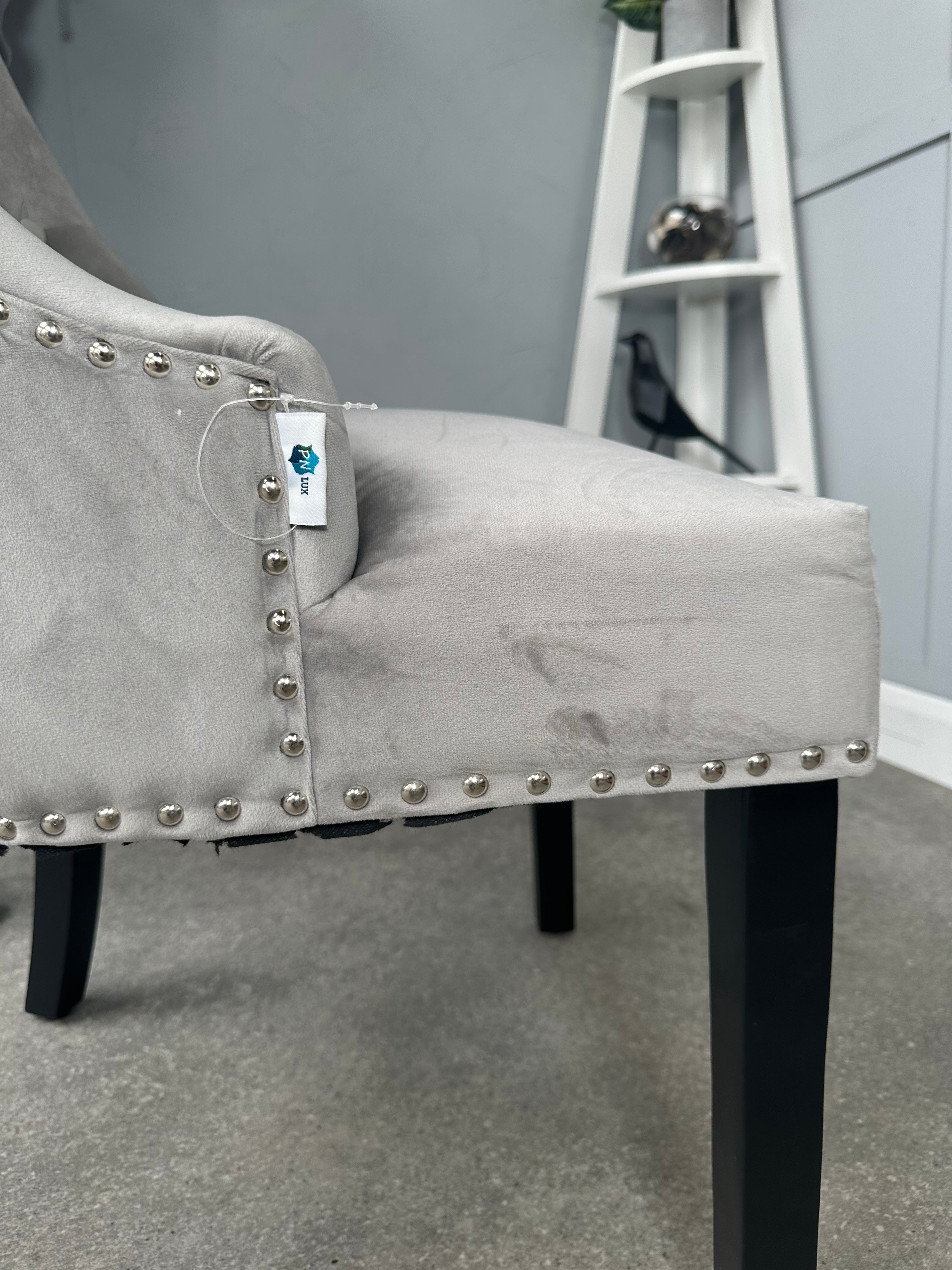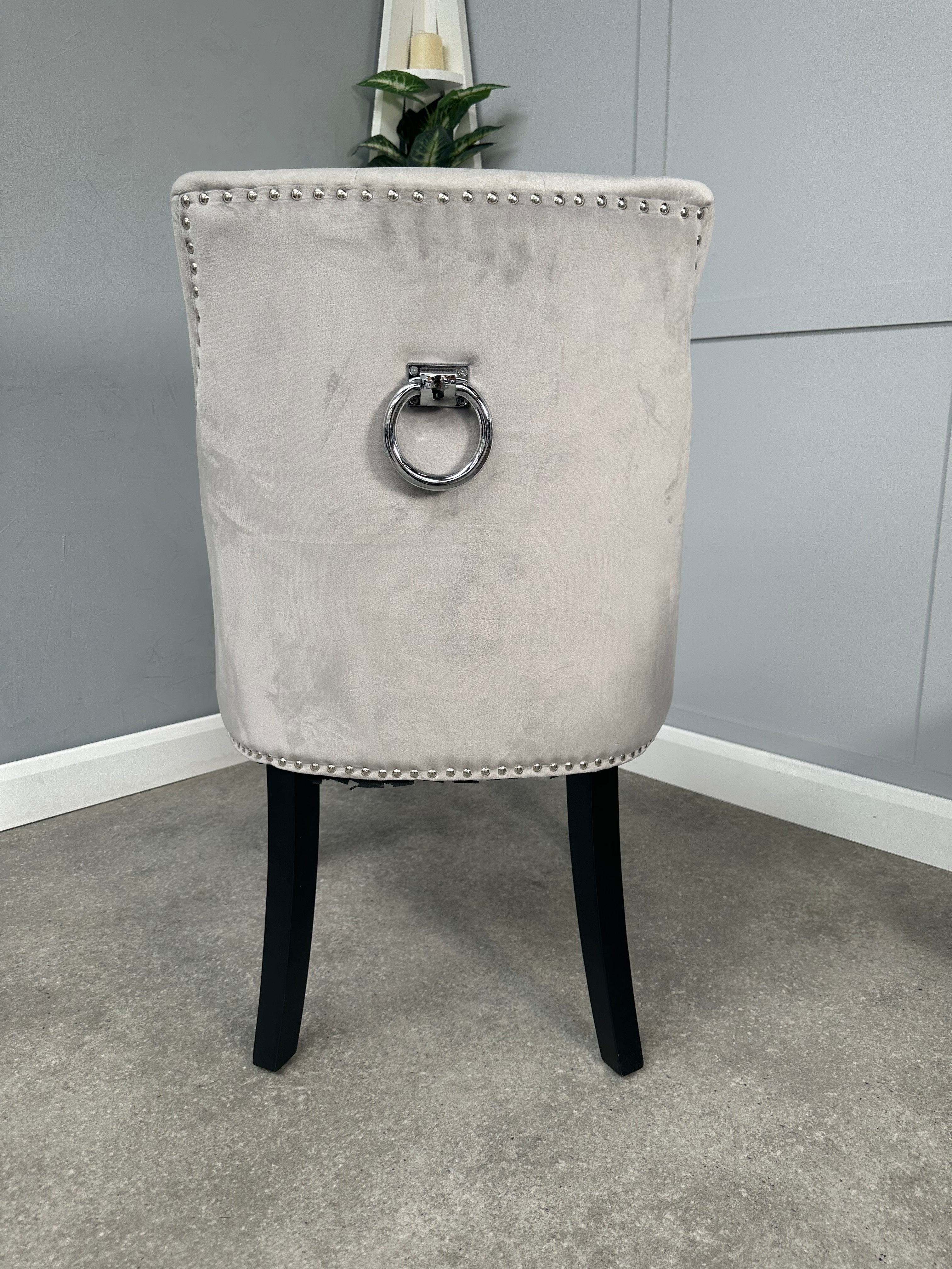 Designer curves, Sweeping arches, Soft edges with Luxury cushioning. The Windsor Dining Chair is a real eye-catcher. With beautiful diamond tufting, metal stud work and knocker handle on the rear to refine the look. Softly textured and wonderfully Plush soft-to-touch velvet. Our Windsor chairs are made using high-grade fabric weaves, with a natural feel that are also easy to clean. Its Silver detailing created with comfort in mind.